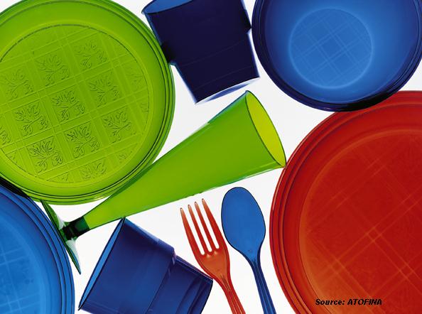 The building block - monomer - of polystyrene is styrene. The raw materials to make styrene are obtained from crude oil. A range of processes such as distillation, steam-cracking and dehydration are required to transform the crude oil into styrene. At the end polystyrene is produced by polymerising styrene. The final product is available in the form of pellets. In order to get the final articles polystyrene pellets are extruded, thermoformed or injection moulded. Extrusion is a process in which the pelletised polymer is melted and then forced continuously through a die to form an endless profile of polymer. Most of the time polystyrene is extruded into sheet. In a second step this sheet can be thermoformed into the final article. Applications of thermoformed articles include disposables such as cups and plates, meat and poultry trays, multiple and single-serving food containers in dairy, vending machine cups, trays for hospital and restaurant use. Injection moulding is a process by which polymer is melted and injected in a mould cavity, which after cooling down solidifies into the shape of the mould. Typical injection moulding applications are housing of televisions, jewel boxes for compact discs, toys and innumerable other uses.